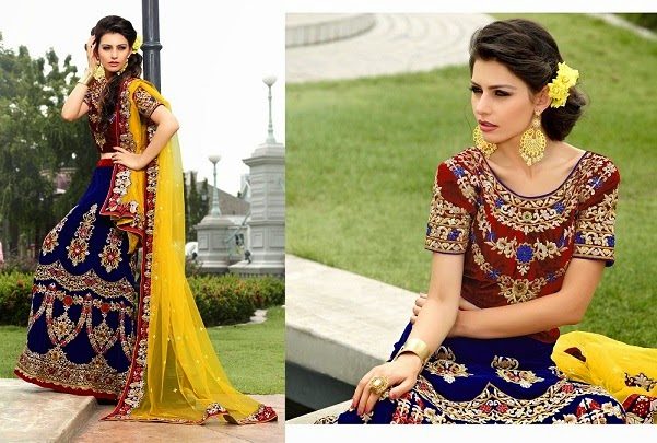Beautiful Navy Blue Velvet Lehanga Choli embellished with Zari,Resham Embroidery, Stone Work with Patch Butta and patch patta work.Lehanga is comes with Switch Cotton lehanga inner, Maroon Velvet Blouse and Yellow Net Dupatta.